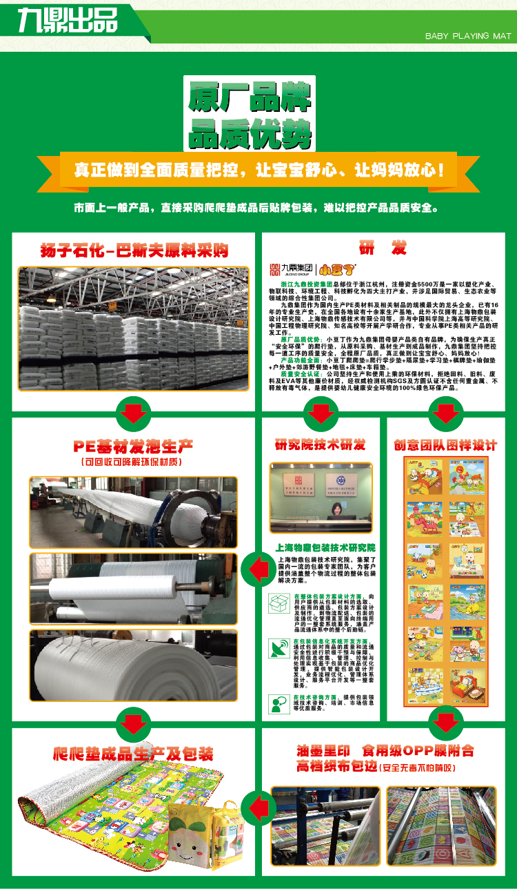 質(zhì)量安全認(rèn)證:公司堅(jiān)持生產(chǎn)和使用上乘的環(huán)保材料,拒絕回料、舊料、廢料及EVA等其他廉價(jià)材質(zhì),經(jīng)權(quán)威檢測機(jī)構(gòu)SGS及方圓認(rèn)證不含任何重金屬、不釋放有毒氣體,是提供嬰幼兒健康安全環(huán)境的100%綠色環(huán)保產(chǎn)品。